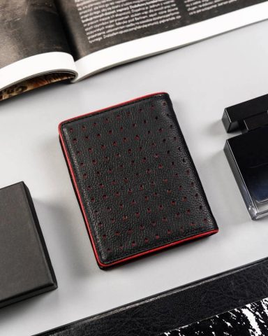 Portfel męski ze skóry naturalnej. Ozdobiony elementami w kontrastowym kolorze. Wewnątrz niezbędne zakładki na karty i dokumenty — zmieszczą dowód rejestracyjny. W centrum dodatkowy, zasuwany schowek. Na banknoty trzy szerokie przegródki