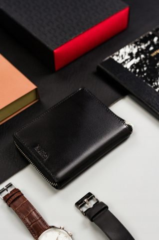 Elegancki portfel o czarnej kolorystyce ze srebrnymi dodatkami. Jest w orientacji pionowej i zamykany na suwak. Odszyty z wysokogatunkowej skóry naturalnej, która gwarantuje elegancki wygląd przez lata. Zapakowany w pudełko.