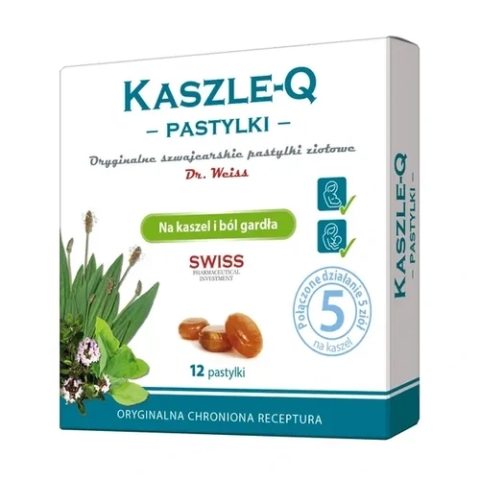 Wyrób medyczny Kaszle-Q Pastylki do ssania dzięki unikalnej kompozycji roślinnych składników pomaga łagodzić najczęstsze objawy przeziębienia jak ból gardła, chrypka, suchy i mokry kaszel. Preparat przeznaczony dla dorosłych i dzieci powyżej 3 lat.