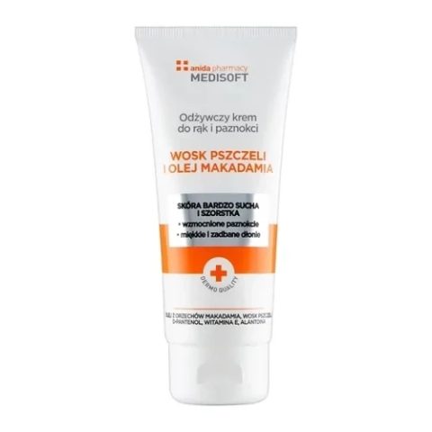 Anida Krem do rąk i paznokci z woskiem pszczelim i olejem makadamia to preparat o działaniu odżywczym, który poprawi kondycję bardzo suchej i szorstkiej skóry dłoni i wzmocni paznokcie. Krem działa natłuszczająco, uelastyczniająco i wygładzająco.