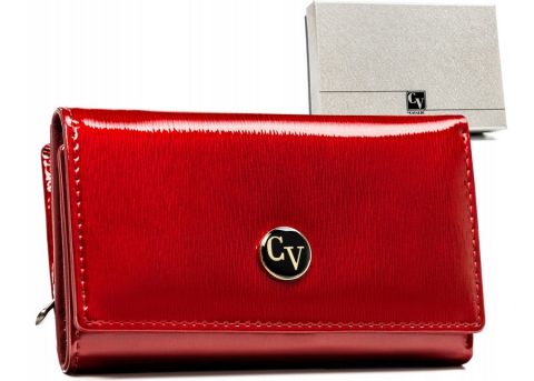 Uszyty z lakierowanej skóry naturalnej. Na klapce umieszczono poziome, czarne przeszycie oraz sporej wielkości logo marki. Portfel w orientacji poziomej zapinany klapką na zatrzask. Posiada szereg praktycznych kieszonek i przegródek.