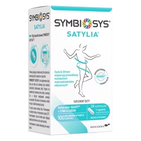 Symbiosys Satylia to suplement diety, który uzupełnia codzienną dietę w bakterie probiotyczne Hafnia alvei HA4597, cynk i chrom. Preparat wspiera utrzymanie równowagi mikrobioty jelitowej oraz prawidłowego metabolizmu makroskładników odżywczych.