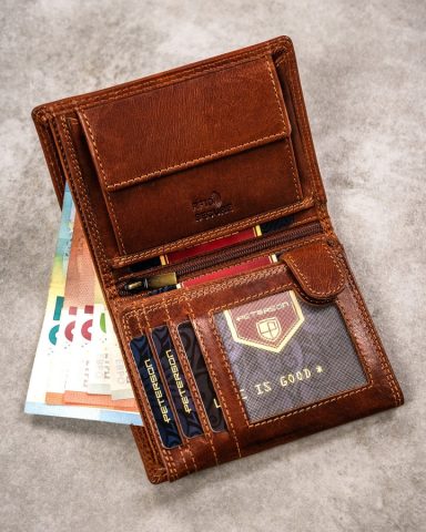 Portfel odszyty z trwałej skóry naturalnej o klasycznej stylistyce. Model w orientacji pionowej bez zapięcia zewnętrznego. Jako symbol osobowości na froncie portfela został wytłoczony znak zodiaku. Posiada rozbudowane wnętrze. Wyposażony w system RFID.