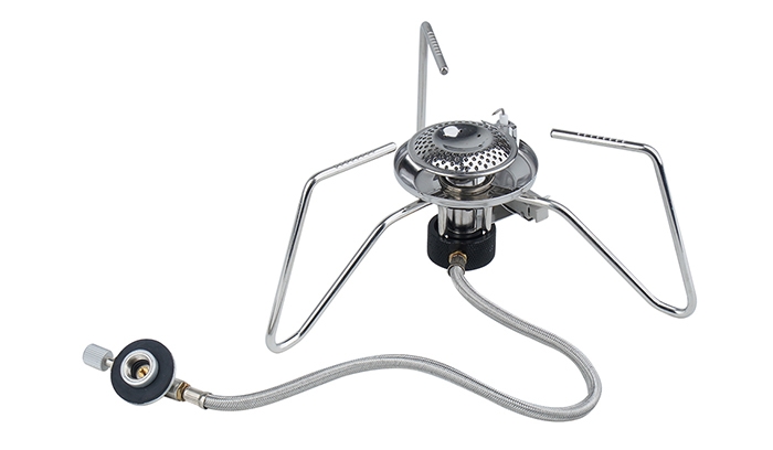Turystyczny palnik gazowy wyposażony w wężyk z gwintem.