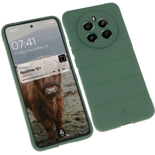 Etui Bizon Case TurRealme 12+ Pancerne etui do Realme 12+Tury leśne zniknęły z powierzchni Ziemi niemal cztery wieki temu. Teraz powracają w zupełnie innej formie!Wyjątkowe etui marki Bizon z serii Tur to ukłon w stronę tego majestatycznego zwierzęcia, niegdyś poddanemu królewskiej ochronie, którą dziś Tur otoczy Twojego smartfona. Obudowa zacnie ochroni urządzenie przed zarysowaniami i zabrudzeniami oraz zminimalizuje czasem tragiczne skutki grawitacji.Wykonane z TPUChroni przed zarysowaniami i zabrudzeniami oraz amortyzuje w razie wstrząsówPodwyższone krawędzieDedykowane wycięcia na obiektywyWzmocnione narożnikiWyściółka z mikrofibryZintegrowane osłony na przyciskiKompatybilne z ładowaniem indukcyjnymKolor producenta: Dark Green (ciemnozielony)Etui kompatybilne ze szkłami* o wymiarach mniejszych niż (dług./szer.): 15,99 x 7,19 cm* Nie wiesz, jakie szkło będzie pasować? Wybierz Bizon Glass Clear!Przedmiotem sprzedaży jest samo etui, pozostałe akcesoria widoczne na zdjęciach służą jedynie przedstawieniu jego funkcjonalności. Wzmocniona konstrukcjaObudowa została wykonana z elastycznego termoplastycznego poliuretanu o grubości 2 mm, wewnątrz którego kryje się delikatna warstwa z mikrofibry, która załagodzi impet uderzenia smartfona o powierzchnię.Design etui nie tylko ciekawie wygląda — wyżłobienia pełnią funkcję niewidzialnych poduszek powietrznych! Tur bez mocnych rogów nie byłby turem, więc takie same amortyzatory zastosowano również w rogach futerału. Uwaga! W środku etui mogą znajdować się przebarwienia. Nie wpływają one na wygląd zewnętrzny obudowy. Ochrona ponad wszystkoZdarza Ci się wypuszczać telefon z dłoni? Tur tak łatwo Ci nie ucieknie!Przywodzące na myśl opony samochodowe, teksturowane boki, zapewniają lepszy chwyt, a gdyby urządzenie i tak upadło — tak jak kanapka, masłem w dół — to nie zderzy się bezpośrednio z podłogą, bo obudowa wystaje ponad krańce telefonu! Podwyższone krawędzie otaczają również wyspę aparatu, co w połączeniu z dedykowanymi wycięciami na soczewki stanowi solidną ochronę obiektywów. Swobodny dostępEtui jest idealnie dopasowane do telefonu, a niewielka grubość pozwala na indukcyjne ładowanie bez potrzeby ściągania obudowy (tylko jeśli Twój telefon potrafi się ładować bezprzewodowo). Pokrowiec posiada wszelkie niezbędne wycięcia, dzięki którym możesz cieszyć się pełnym dostępem do portów.