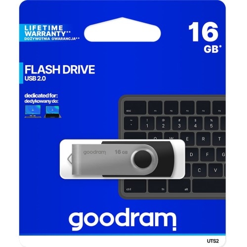 Pendrive USB-A 2.0 Goodram UTS 2  Uniweralne / USB-A    Twój mobilny magazyn danych Goodram UTS 2 to pendrive, który łączy wygodę użytkowania z wytrzymałością. Obudowa z solidnego tworzywa z metalową, obrotową blaszką chroniącą złącze USB pozwala cieszyć się trwałością i niezawodnością urządzenia. System obrotowy zabezpiecza złącze bez potrzeby stosowania dodatkowych osłon, co doceni każdy roztargniony użytkownik. UTS 2 jest lekki i kompaktowy, dzięki czemu bez problemu mieści się w kieszeni, portfelu lub przy kluczach. Pendrive posiada też możliwość zaczepienia na smyczy, co pozwala mieć go zawsze przy sobie i korzystać z niego w każdej chwili. Kolor producenta: Black (czarny) Pojemność: 16GB    Niezawodna jakość pamięci od Goodram Z odczytem do 20 MB/s i zapisem do 5 MB/s pendrive Goodram UTS 2 zapewnia płynne przesyłanie plików, idealne do codziennego użytkowania. Pendrive pozwala przechować tysiące zdjęć, plików muzycznych czy dokumentów, sprawiając, że jest to doskonały wybór dla każdego, kto potrzebuje prostego i wydajnego nośnika danych. Kompatybilność z wcześniejszą wersją USB 1.1 sprawia, że UTS 2 będzie działał na niemal każdym urządzeniu, niezależnie od systemu operacyjnego.    Uniwersalna kompatybilność Wystarczy podłączyć go do dowolnego urządzenia zgodnego z systemami Windows, macOS czy Linux i korzystać bez instalacji dzięki funkcji Plug&Play.    Dane techniczne Interfejs: USB 2.0 typu A Wsteczna kompatybilność z protokołem USB 1.1 Pojemność: 16 GB Prędkość odczytu: do 20 MB/s Prędkość zapisu: do 5 MB/s Kompatybilność: Windows 2000 SP4 i nowsze / MacOS 10.5.x i nowsze / Linux v.2.6.x i nowsze Waga produktu: 15 g Wymiary produktu: 57,1 x 19,3 x 10,7 mm W zestawie: pendrive