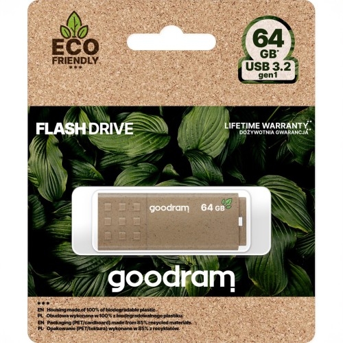 Pendrive USB-A 3.0 Goodram UME3 Eco Friendly Uniweralne / USB-A Ekologiczny i praktyczny — taki jest pendrive od GoodRam! Pendrive Goodram UME3 Eco Friendly wyróżnia się obudową w pełni biodegradowalną, która rozkłada się w warunkach kompostowych, pomagając zmniejszać negatywny wpływ na środowisko. Dodatkowo opakowanie wykonano w 85% z materiałów pochodzących z recyklingu. Ergonomiczna zatyczka z antypoślizgowym wzorem ułatwia szybkie otwieranie, a opcja przypięcia zawieszki zapewnia, że pendrive zawsze będzie pod ręką, gotowy do użytku. Kolor producenta: Brown (Brązowy) Pojemność: 64GB Szybki i pojemny Pendrive ten oferuje interfejs USB 3.2 gen 1, zapewniając prędkość odczytu do 60 MB/s oraz zapis do 20 MB/s. Szybki transfer danych ułatwi Ci codzienną pracę i przechowywanie ważnych dokumentów, zdjęć czy multimediów. Pendrive pozwala przechować tysiące zdjęć, plików muzycznych czy dokumentów, sprawiając, że jest to doskonały wybór dla każdego, kto potrzebuje prostego i wydajnego nośnika danych. UME3 Eco Friendly jest kompatybilny z szerokim zakresem portów USB (3.1, 3.0, 2.0, 1.1), co sprawia, że możesz go używać zarówno na najnowszym sprzęcie, jak i starszych urządzeniach. Uniwersalna kompatybilność Wystarczy podłączyć go do dowolnego urządzenia zgodnego z systemami Windows, macOS czy Linux i korzystać bez instalacji dzięki funkcji Plug&Play. Dane techniczne Interfejs: USB-A 3.2 gen. 1 Wsteczna kompatybilność z protokołami USB 3.1, 3.0, 2.0 i 1.1 Pojemność: 64 GB Prędkość odczytu: do 60MB/s Prędkość zapisu: do 20MB/s Kompatybilność: Windows 2000 SP4 i nowsze / MacOS 10.5.x i nowsze / Linux v.2.6.x i nowsze Waga produktu: 9 g Wymiary produktu: 55,0 x 21,0 x 9,6 mm W zestawie: pendrive