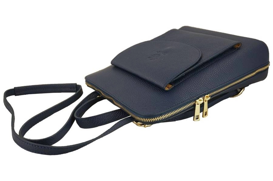 Wnętrze plecaka: jednokomorowy plecak damski skórzany wykończony jest podszewką. Komora główna plecaka przedzielona jest zasuwaną kieszenią mieszczącą np. kosmetyki. Dodatkowo wewnątrz znajduje się mniejsza zasuwana kieszonka oraz miejsce na telefon. Plecak skórzany / listonoszka - Casual 2w1 posiada złote okucia, suwak otwiera plecak na całej długości, co ułatwia swobodne dostanie się do rzeczy wewnątrz. Długi regulowany pasek (maksymalna dł. 180cm, maksymalna wys. 88cm) umożliwia noszenie na dwa sposoby - jako plecak lub listonoszka. Na zewnątrz znajdują się dwie kieszenie - z tyłu zasuwana, z przodu na zatrzask magnetyczny. Na usztywnionym spodzie znajdują się metalowe stopki chroniące przed otarciem.
