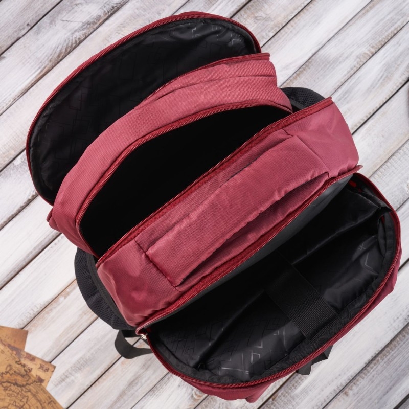 Plecak jest pojemny i wyróżnia się przemyślanym rozkładem wnętrza. Głęboka kieszeń frontowa zmieści wszystkie najczęściej wyciągane akcesoria. Po bokach umieszczono dwie kieszenie z elastycznej siateczki. Plecak posiada dwie komory główne – mniejszą oraz większą, w których z powodzeniem schowasz męskie niezbędniki. Model T–102 został wyposażony w tylną kieszeń na suwak z przegrodą na laptopa, wyłożoną pianką dystansową i zapinaną rzepem. Na dnie plecaka umieszczono kieszonkę–skrytkę na suwak, w której znajdziesz pokrowiec przeciwdeszczowy. Komfort noszenia plecaka nawet przy dużych obciążeniach zapewnia siatkowana pianka, którą wyłożono uchwyt oraz regulowane szelki.