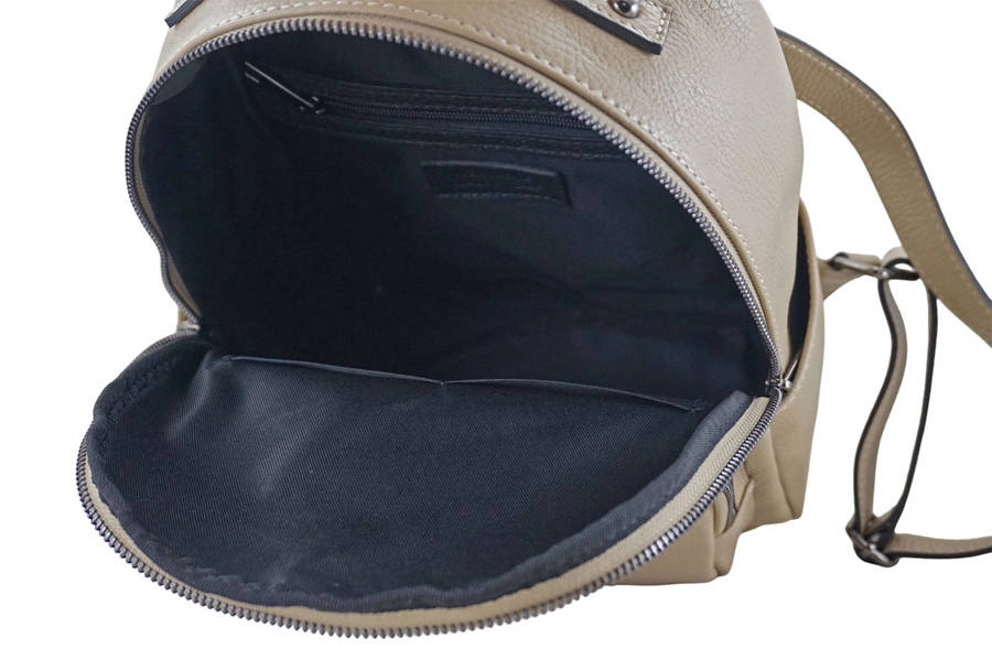 Wnętrze plecaka: pojemne eleganckie plecaki skórzane są wykończone podszewką. Wewnątrz wyodrębniono małą zasuwaną kieszeń mieszczącą drobne kosmetyki oraz dwie wygodne otwarte kieszenie na telefon, portfel lub mały notes. Klasyczne i eleganckie plecaki skórzane posiadają ciemne metalowe okucia, krótki uchwyt do ręki, ozdobiony dwoma nitami, oraz wygodnej długości paski z regulacją (maksymalna dł. 75cm, maksymalna wys. 50cm). Z przodu znajduje się pojemna kieszeń (wymiary - wys.: 16cm, szer.: 21cm), z tyłu poręczna pionowa zasuwana kieszonka umożliwiająca szybki dostęp np. do kluczy. Dodatkowo, po obu stronach, znajdują się boczne kieszenie / schowki. Ze względu na swoją kompaktową budowę, poręczny kształt, a do tego łatwość noszenia eleganckie plecaki skórzane będą idealną propozycją galanterii skórzanej na każdą okazję.