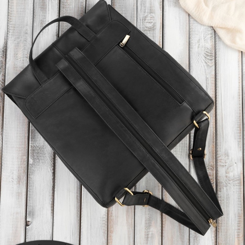 Duży plecak damski T-72 został wykonany z miękkiej w dotyku skóry naturalnej hunter w kolorze czarnym. Pod klapą zapinaną na magnetyczne napy znajdują się dwie wsuwane komory główne oraz głęboka kieszeń na suwak. W niej znajdziesz dwie kieszonki wsuwki (jedną na telefon) oraz kieszonkę na zamek. Dodatkowe miejsce do przechowywania stanowi tylna, pionowa kieszeń. Plecak z powodzeniem mieści format A4, co czyni go odpowiednim w pracy lub na uczelni.