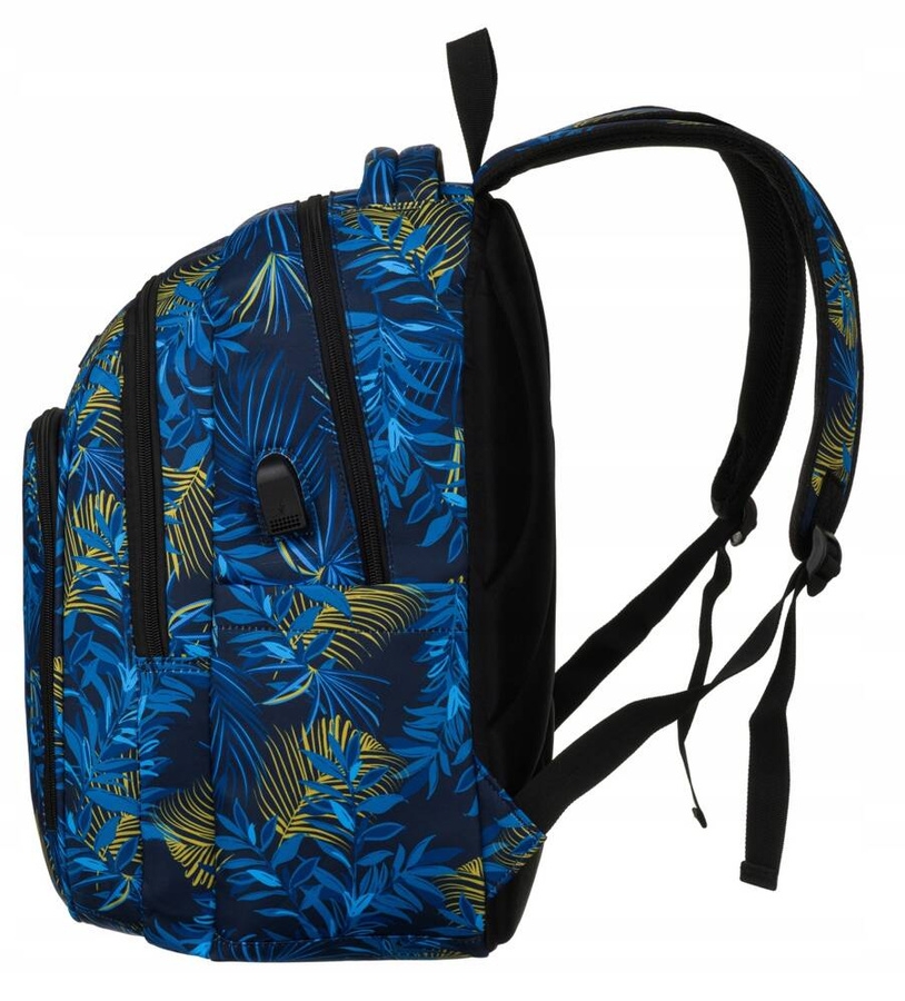 Dwukomorowy plecak to połączenie funkcjonalności, wygody i sportowego designu. Plecak w dominującym kolorze granatowym, stworzony z wysokiej jakości materiału – poliestru, pokrytego roślinnym wzorem.
