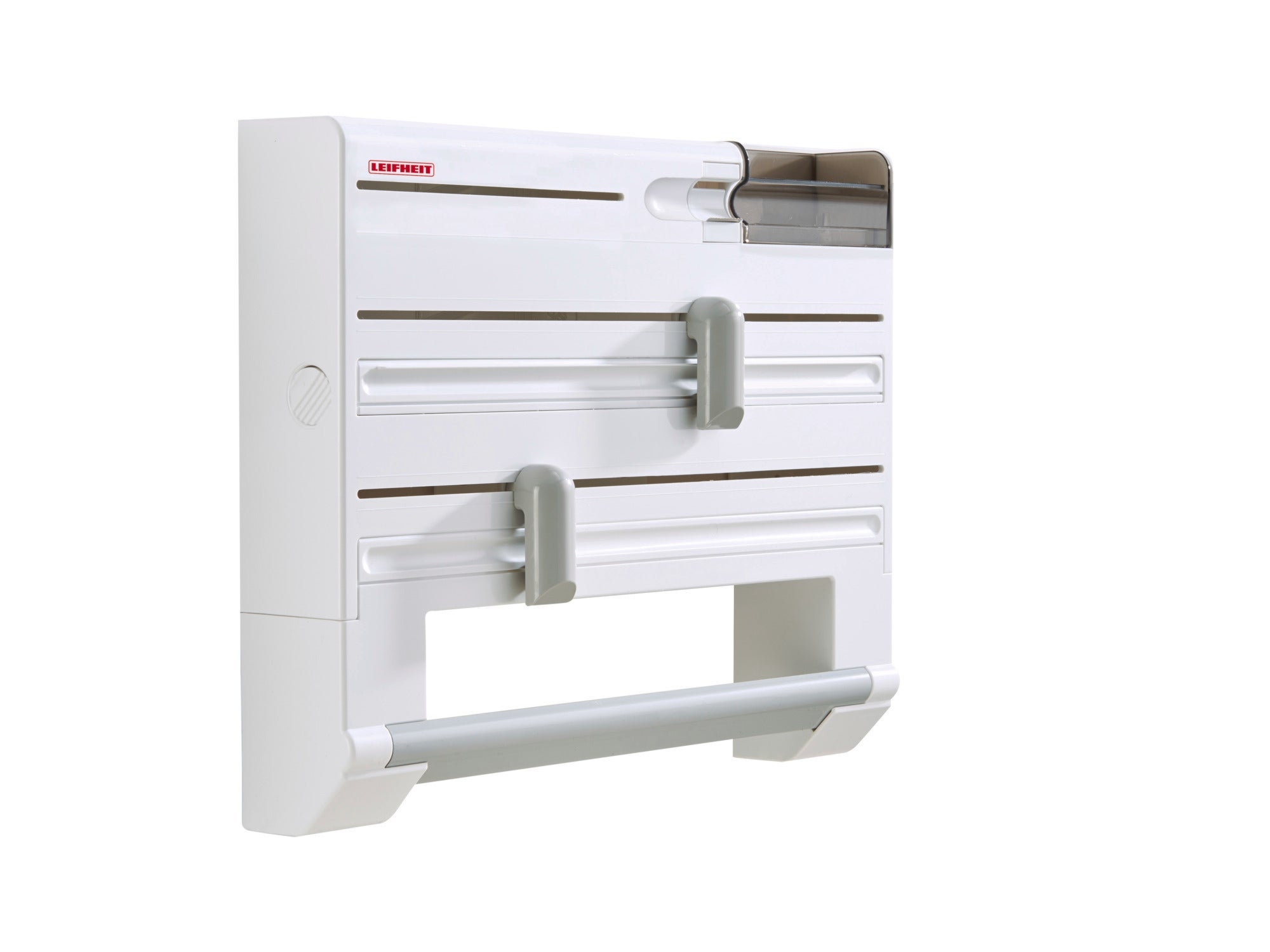 Na uwagę zasługuje zwłaszcza wszechstronność tego produktu. Model ten mieści dwie rolki folii spożywczej lub aluminiowej, rolkę ręczników papierowych, posiada podajnik na torebki śniadaniowe lub woreczki do zamrażania, uchwyt na taśmę klejącą oraz schowek na drobiazgi takie jak klipsy do zamykania. Wszystkie akcesoria ułatwiające pracę w kuchni i pakowanie produktów znajdą się w jednym miejscu i będą zawsze pod ręką. Dzięki temu rozwiążesz problem szukania kilku produktów, który od lat powodował stratę czasu.