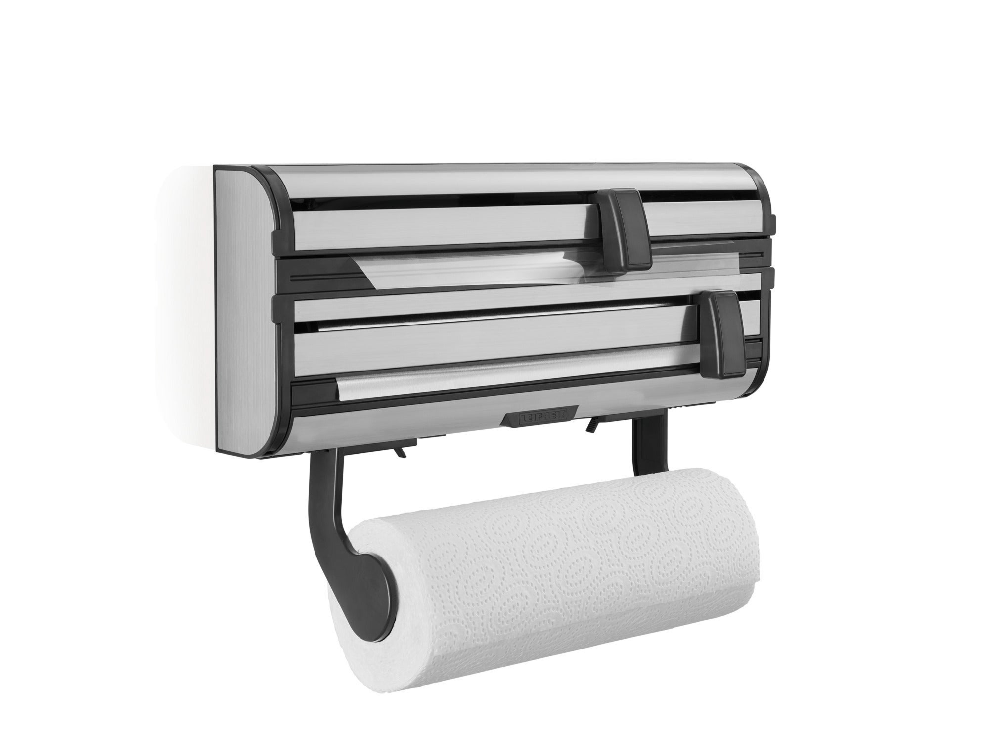 Podajnik do folii i papieru Parat Royal marki Leifheit niezwykle ułatwia pracę w kuchni. Jego matowa obudowa została wykonana z bardzo wysokiej jakości nierdzewnej, szczotkowanej stali. Uzupełniają ją elementy z tworzywa sztucznego w kolorze eleganckiej czerni. Doskonale dopasuje się do każdego wnętrza. W podajniku mieści się rolka folii aluminiowej, folii spożywczej oraz rolka ręcznika papierowego. Folie są schowane za obudową, a każdą z komór można otworzyć niezależnie od drugiej, co znacznie ułatwia i przyspiesza wymianę rolek. Folie odcina się za pomocą wytrzymałych i niezwykle precyzyjnych ostrzy ze stali nierdzewnej. Można zapomnieć o postrzępionych końcach i nierównościach. Ostrza przesuwa się za pomocą poręcznych uchwytów, które zabezpieczają palce przed skaleczeniem. Po odcięciu końce folii wystają z podajnika, więc wygodnie można ją znów wysunąć na pożądaną długość.