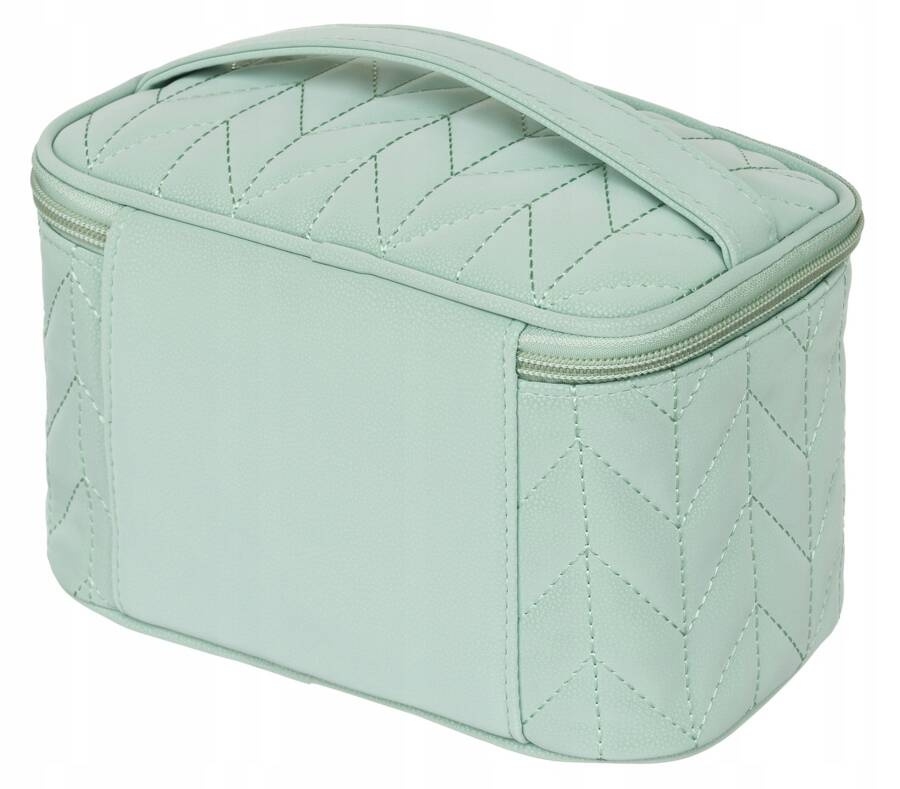 Kosmetyczka o kształcie kuferka zamykana na zamek błyskawiczny. Wykonana ze skóry ekologicznej pokrytej jodełkowym wzorem. Zawiera dużą komorę na kosmetyki oraz przegródki na akcesoria.
