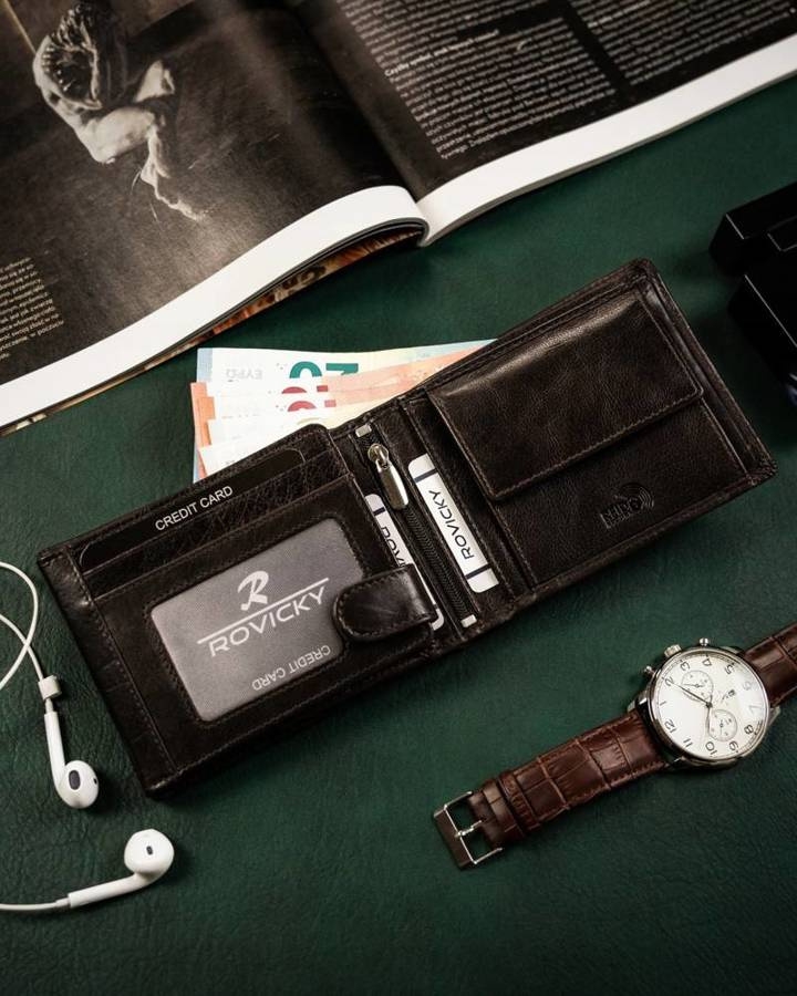 Elegancki i praktyczny portfel męski odszyty z wysokogatunkowej skóry naturalnej licowej. Wyposażony w technologię RFID. W środku 9 przegródek na karty, 3 przegródki na nieco większe dokumenty oraz 1 pojemna kieszeń na monety zamykana na nap.