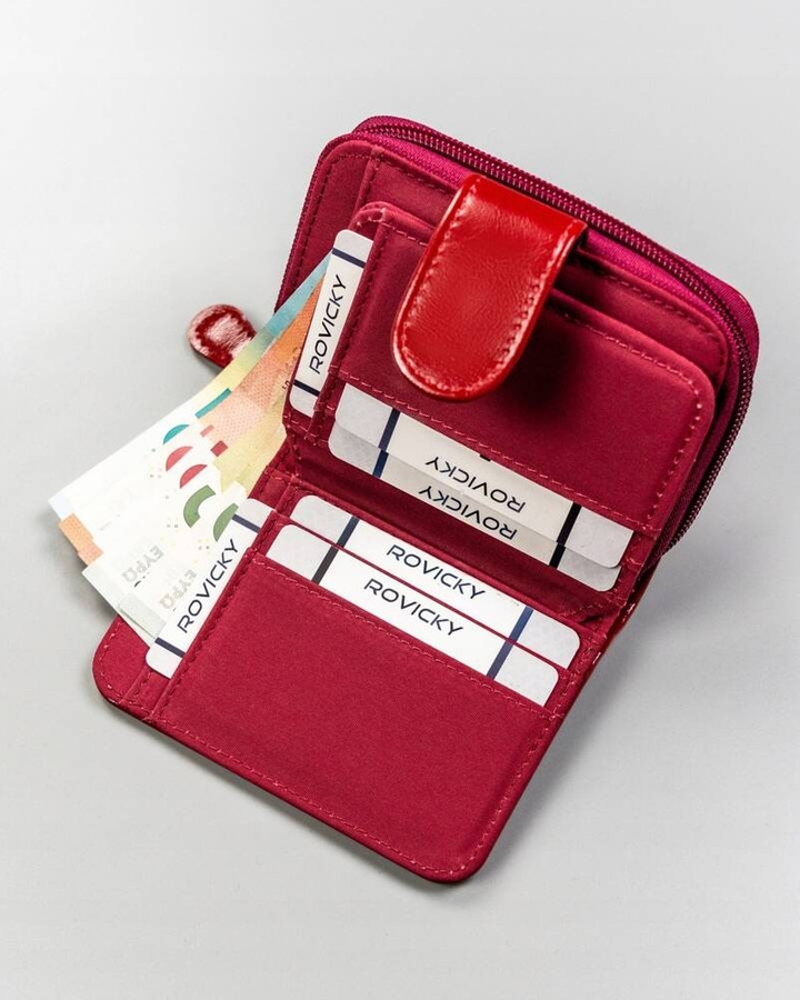 Portfel uszyty z eko skóry. Portfel posiada dwie pojemne kieszenie na bilon. W portfelu znajdują się dwie przegródki, do których możesz włożyć fotografie bliskich. Wyposażony w dwa praktyczne zapięcia: suwak i zatrzask.