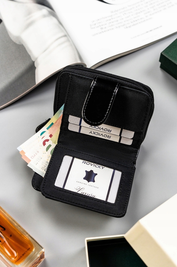 Portfel uszyty z eko skóry. Portfel posiada dwie pojemne kieszenie na bilon. W portfelu znajdują się dwie przegródki, do których możesz włożyć fotografie bliskich. Wyposażony w dwa praktyczne zapięcia: suwak i zatrzask.