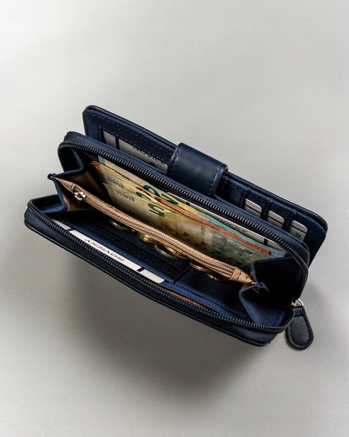 Portfel został odszyty z wysokogatunkowej skóry ekologicznej. Wnętrze na podszewce. Z tyłu portfela znajduje się praktyczna kieszonka z okienkiem. Portfel został wyposażony w dwa praktyczne zapięcia: suwak i zatrzask.
