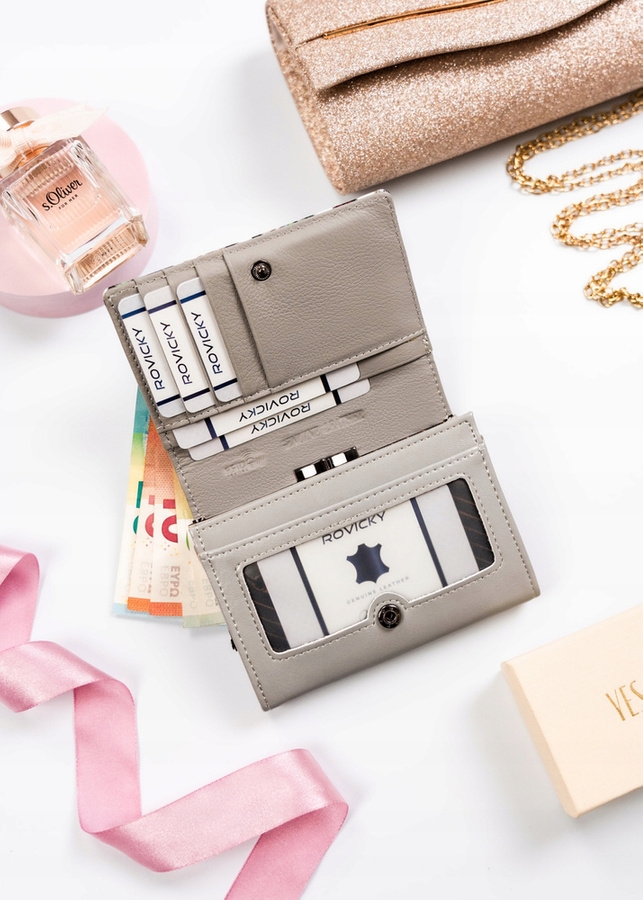 W tym modelu zastosowano połączenie skóry naturalnej ze skórą ekologiczną. Środek portfela jest wykończony skórą naturalną, natomiast zewnętrzna część to skóra eko. Pomieścisz w nim karty, dokumenty, gotówkę i bilon. Portfel wyposażony w system STOP RFID.