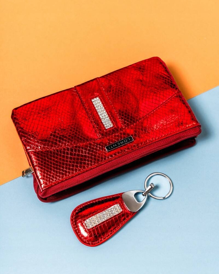 Wykonany ze skóry naturalnej. Dodatkowo front zdobi paseczek wysadzany cyrkoniami. Specjalnie zaprojektowany, aby pomieścić również dowód rejestracyjny. Portfel wyposażony w system STOP RFID.