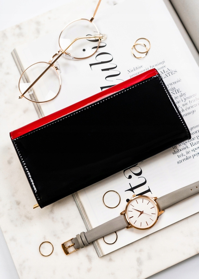 Duży portfel damski wykonany ze skóry naturalnej, zamykany trwałym zatrzaskiem. Akcesorium w orientacji poziomej. Portfel wyposażony w technologię RFID BLOCKING SYSTEM. Kieszeń na momenty zamykana na suwak.