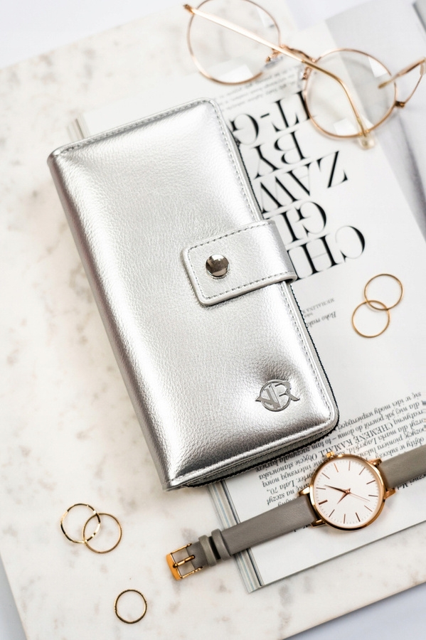 Portfel wyróżnia się swoim stylowym designem. Srebrny kolor w połączeniu ze srebrnymi okuciami tworzy harmonijną całość. Wykonany z wysokiej klasy skóry ekologicznej, która gwarantuje długowieczność portfela.