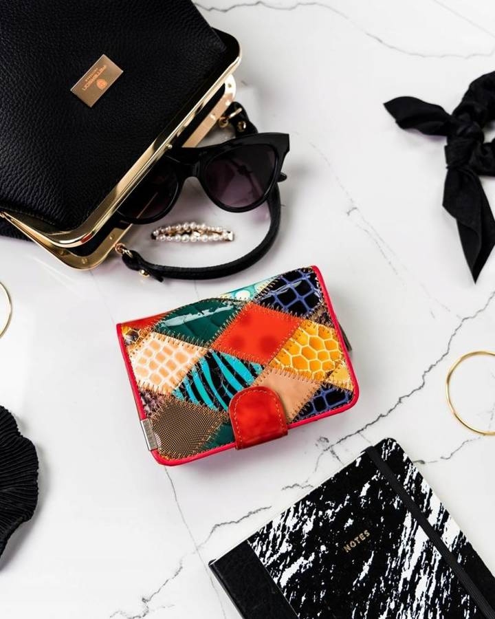 Odszyty ze skóry naturalnej lakierowanej. Powierzchnię portfela zdobi patchworkowy wzór. Jest to metoda szycia, w której zszywa się ze sobą kawałki materiału o różnorodnej fakturze i wzorach. Portfel wyposażony w technologię RFID.
