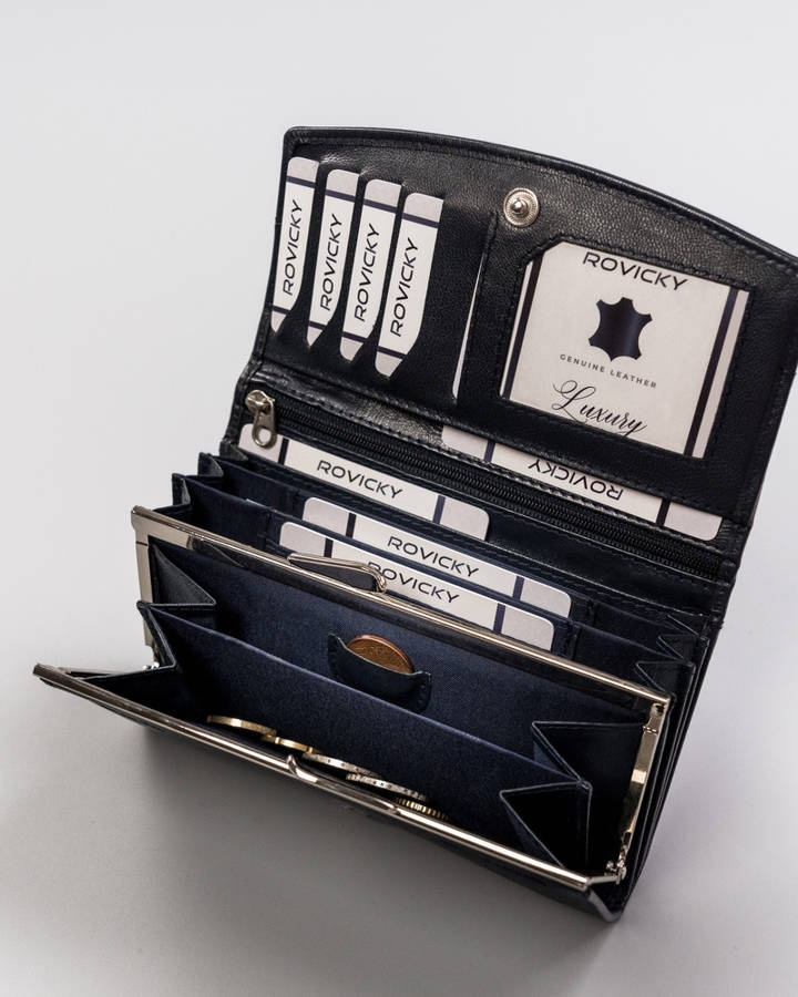 Skórzany portfel damski w średnim rozmiarze. Zabezpieczony wytrzymałą klapą zamykaną zatrzaskiem. Wewnątrz wiele zakładek na karty i dokumenty oraz niezbędne sekcje na gotówkę. Akcesorium zabezpieczone membraną antyskimmingową.