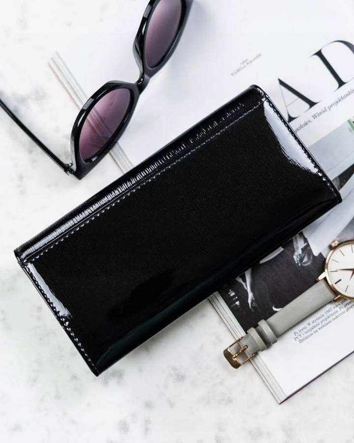 Uszyty z wysokogatunkowej skóry naturalnej z wierzchu pokrytej lakierem. Portfel poziomy zamykany klapką na zatrzask. Front zdobi logo marki. Pojemny i funkcjonalny. Zapakowany jest w firmowe pudełeczko z twardej tektury.