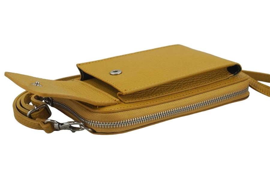 Wnętrze portfela/etui: portfel / etui na telefon ze skóry naturalnej posiada dwie odrębne strefy. W części na suwak znajduje się zasuwana kieszonka na monety, przegrody na banknoty oraz osiem miejsc na karty płatnicze, lojalnościowe, dowód osobisty i prawo jazdy. Portfel / etui na telefon ze skóry naturalnej posiada srebrne okucia, dużą kieszeń na zatrzask (wymiary kieszeni: wysokość 17cm, szerokość 9cm, głębokość 2cm) oraz doczepiany i regulowany pasek (maksymalna dł. 122cm, maksymalna wys. 64cm).  Ofertę kierujemy do kobiet, dla których wygoda jest podstawowym kryterium w wyborze praktycznych rozwiązań do przechowywania dokumentów oraz telefonu, idealnych na zakupy, spacer lub np. jazdę na rowerze, rolkach... Wygodny i praktyczny portfel / etui na telefon ze skóry naturalnej nie krepuje ruchów przewieszony przez ramię, jednocześnie będzie gustownym dodatkiem stroju zarówno casualowego jak i sportowego.