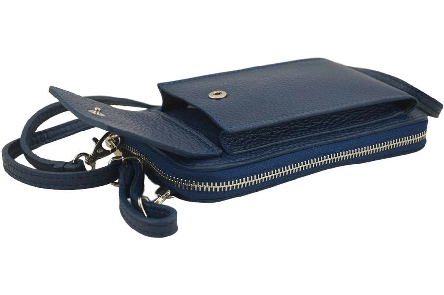 Wnętrze portfela/etui: portfel / etui na telefon ze skóry naturalnej posiada dwie odrębne strefy. W części na suwak znajduje się zasuwana kieszonka na monety, przegrody na banknoty oraz osiem miejsc na karty płatnicze, lojalnościowe, dowód osobisty i prawo jazdy. Portfel / etui na telefon ze skóry naturalnej posiada srebrne okucia, dużą kieszeń na zatrzask (wymiary kieszeni: wysokość 17cm, szerokość 9cm, głębokość 2cm) oraz doczepiany i regulowany pasek (maksymalna dł. 122cm, maksymalna wys. 64cm).  Ofertę kierujemy do kobiet, dla których wygoda jest podstawowym kryterium w wyborze praktycznych rozwiązań do przechowywania dokumentów oraz telefonu, idealnych na zakupy, spacer lub np. jazdę na rowerze, rolkach... Wygodny i praktyczny portfel / etui na telefon ze skóry naturalnej nie krepuje ruchów przewieszony przez ramię, jednocześnie będzie gustownym dodatkiem stroju zarówno casualowego jak i sportowego.