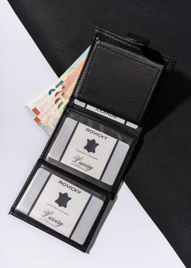 Portfel wykonany ze skóry ekologicznej został wyposażony w praktyczną czarną podszewkę. W tym modelu znajdziesz dużą ilość przegródek na wszystkie swoje karty i dokumenty. Portfel zapinany na zatrzask.