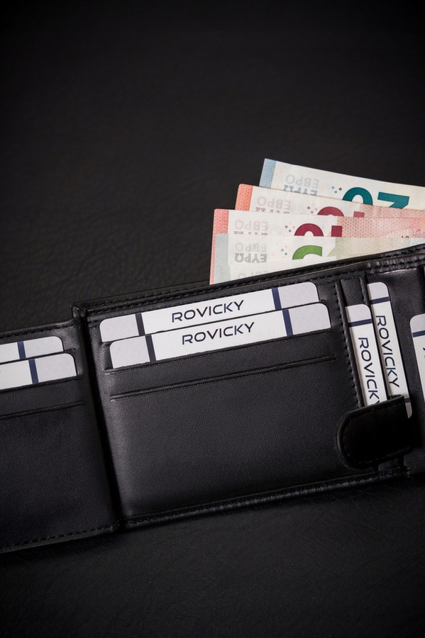 Portfel wykonany ze skóry ekologicznej został wyposażony w praktyczną czarną podszewkę. Model w czarnym kolorze. Znajdziesz w nim dużą ilość przegródek na wszystkie karty i dokumenty. Portfel zamykany na zatrzask.