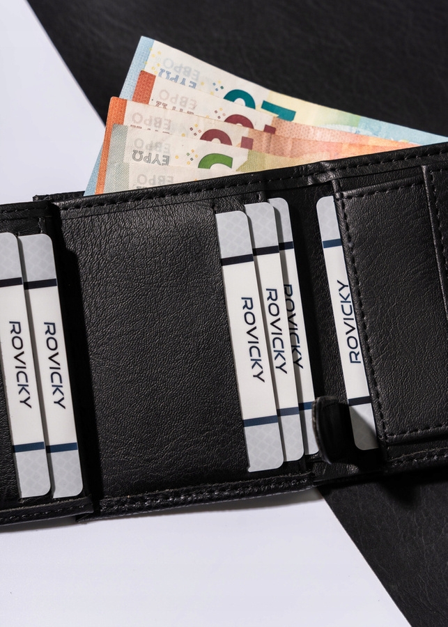 Portfel wykonany ze skóry ekologicznej został wyposażony w praktyczną czarną podszewkę. W tym modelu znajdziesz dużą ilość przegródek na wszystkie swoje karty i dokumenty. Brak zapięcia oznacza szybki i wygodny dostęp do zawartości portfela.
