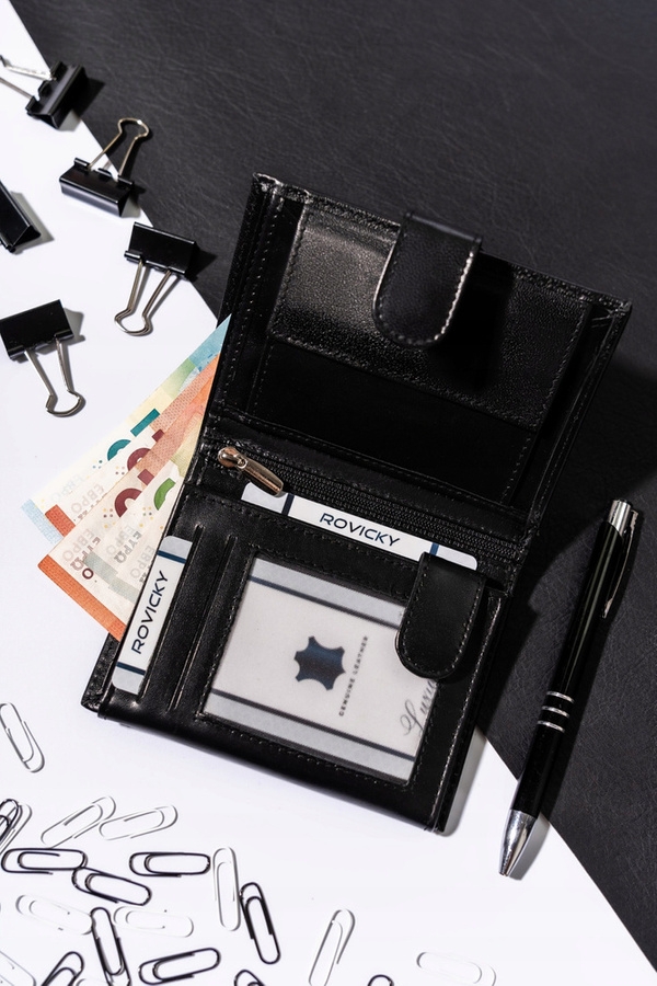 Odszyty bardzo trwale z gładkiej skóry naturalnej. Model w orientacji pionowej zapinany na zatrzask. Mieści dowód rejestracyjny. Wyposażony w technologię RFID BLOCKING SYSTEM.