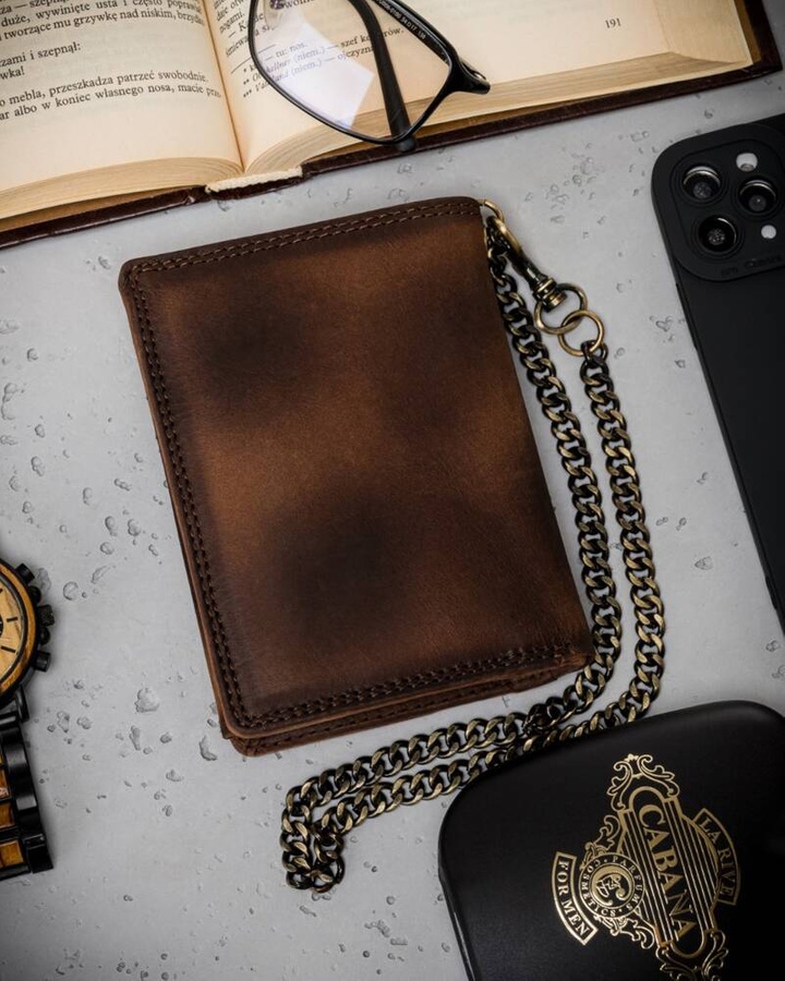 Uszyty z wysokogatunkowej skóry naturalnej nubukowej. Na powierzchni portfela umieszczono wytłoczony rysunek czaszki. Model nie mieści dowodu rejestracyjnego. Portfel zawieszony na długim i solidnym łańcuszku. Wyposażony w system RFID.