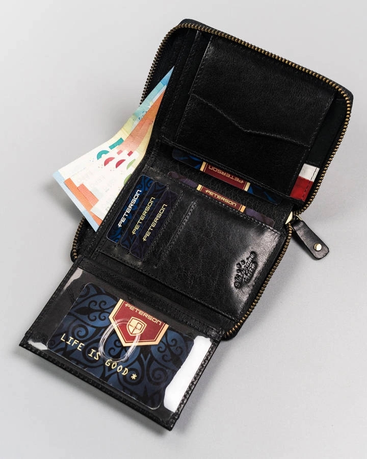 Portfel patriotyczny z godłem Polski oraz paskiem symbolizującym flagę. Wykonany ze skóry naturalnej, zamykany suwakiem. Wewnątrz zakładki na karty, schowki na duże dokumenty oraz przegrody na banknoty i kieszonkę na bilon. Zapakowany w tematyczną puszkę.