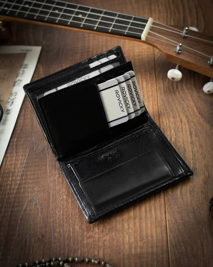 Portfel odszyty z naturalnej skóry w czarnym kolorze. Ma rozbudowane sekcje w bardzo intuicyjny sposób, organizacja wnętrza jest na najwyższym poziomie. Zabezpieczony we wkładkę RFID, która chroni przed niechcianym odczytem danych z karty płatniczej.