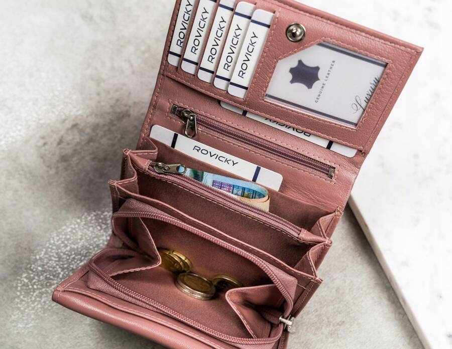 Portfel damski uszyty z mocnej i trwałej skóry naturalnej bydlęcej, lekko połyskującej. Wyposażony w technologię RFID - Twoja gotówka i karta debetowa będą bezpieczne! Ma 1 kieszeń na banknoty, 5 przegródek na karty i mieści dowód rejestracyjny.