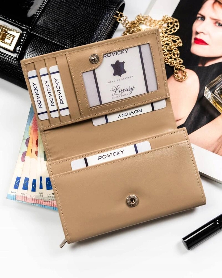 Uszyty z mocnej i trwałej skóry naturalnej bydlęcej, lekko połyskującej, nie lakierowanej. Wyposażony w technologię RFID. Posiada 9 schowków na karty i mieści dowód rejestracyjny.