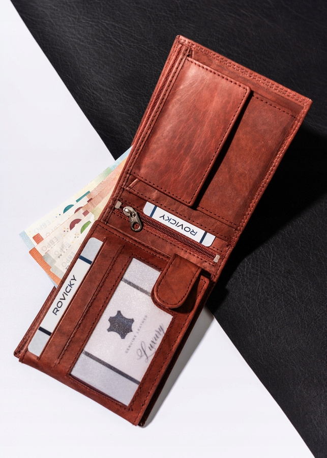 Portfel został starannie odszyty z wysokiej jakości skóry naturalnej. Elegancki kształt, który z pewnością sprosta oczekiwaniom zarówno miłośników klasyki, jak i nowoczesnych rozwiązań. Środek portfela zawiera liczne przegródki i kieszonki.