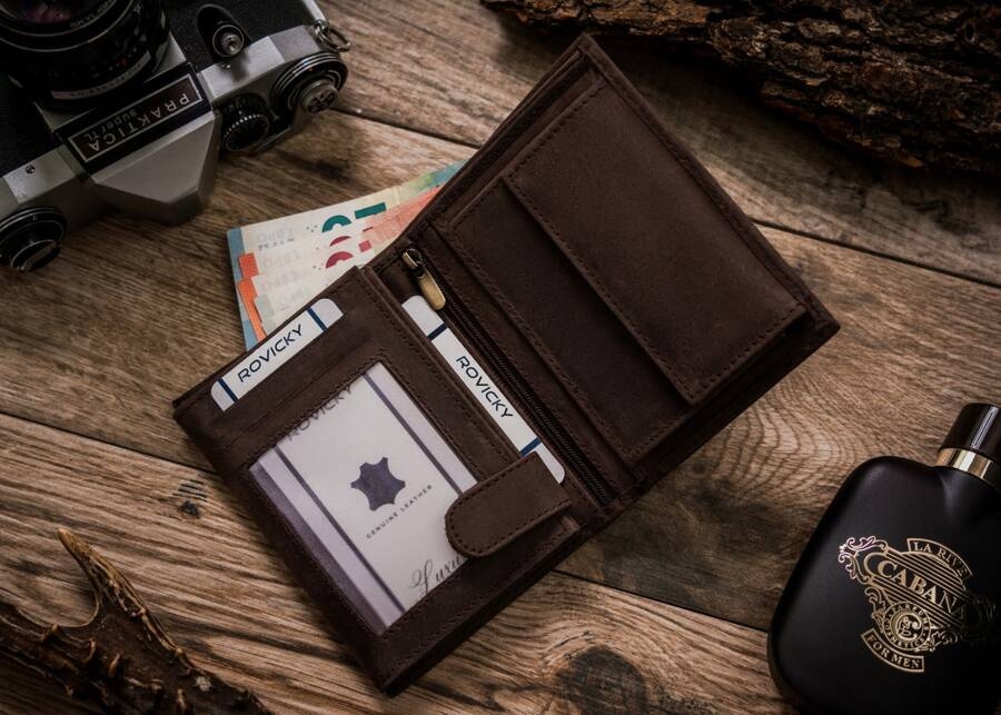 Portfel odszyty z trwałej nubukowej skóry naturalnej. Model o klasycznej stylistyce. Portfel w orientacji pionowej, bez zapięcia zewnętrznego. Posiada rozbudowane wnętrze. Wyposażony w technologię RFID BLOCKING SYSTEM.