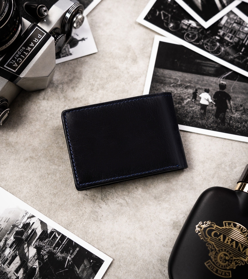 Odszyty bardzo trwale z naturalnej skóry bydlęcej. Portfel w orientacji poziomej. Chociaż portfel jest nieduży, posiada szereg praktycznych przegródek. Umożliwia to zmieszczenie w nim dużej ilości gotówki i kart. Wyposażony w system RFID.