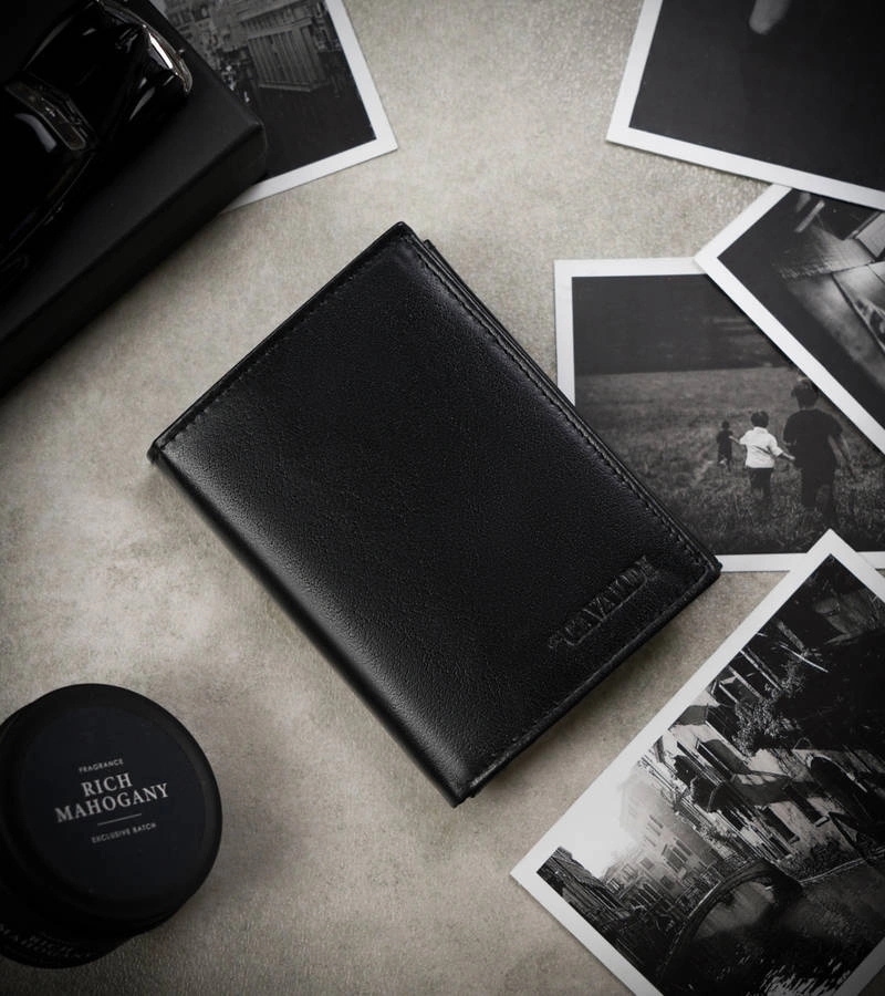 Pionowy, skórzany portfel męski z ochroną RFID Protect. Wyposażony w liczne zakładki na karty oraz kieszenie na dokumenty, które zmieszczą dowód rejestracyjny. W centralnej części portfela zasuwany schowek. Akcesorium z klasycznymi sekcjami na gotówkę.
