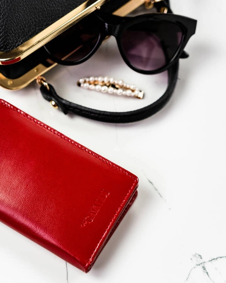 Średnich rozmiarów, pionowy portfel damski na zatrzask. Wykonany z bardzo dobrej jakości skóry naturalnej. Wewnątrz duża sekcja na karty i dokumenty oraz kieszeń na banknoty. Sekcja na bilon zewnętrzna, zamykana suwakiem. Portfel z systemem RFID Protect.