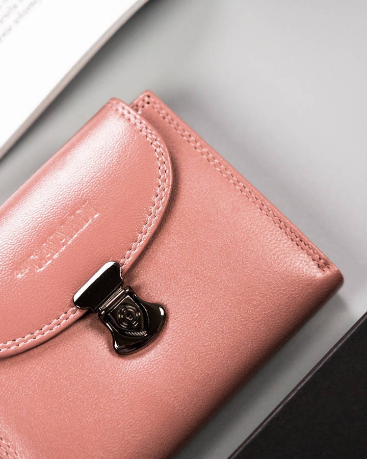 Elegancki portfel damski zamykany klapką z bezpiecznym zapięciem, odszyty z mocnej i trwałej skóry naturalnej bydlęcej. Posiada kieszeń na bilon zamykaną na nap, 9 przegródek na karty oraz 4 na większe dokumenty, np. dowód rejestracyjny. Ochrona RFID.