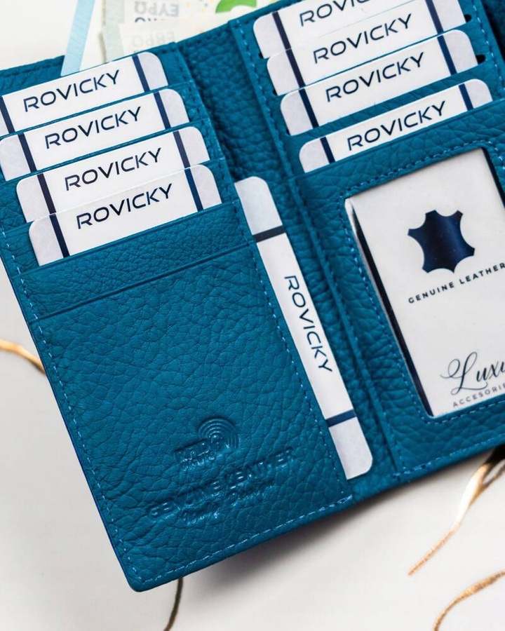 Odszyty z błyszczącej, wysokogatunkowej skóry naturalnej. Środek jest dobrze zorganizowany i posiada dużo miejsc na karty i dokumenty. Portfel wyposażony w system RFID. Na swojej zewnętrznej powierzchni zdobiony jest błyszczącym wzorem imitującym fale.