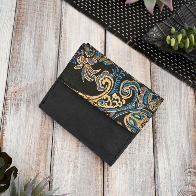 Prezentowany model zachwyci każdą kobietę, która poszukuje pojemnego, niedużego portfela. Portfel został wykonany z połączenia dwóch skór naturalnych – zamszu malowanego we wzór orientalny oraz wytrzymałej skóry hunter. Model T-11 zapinany jest na solidne napy. Z jednej strony znajduje się kieszeń na bilon. W drugiej sekcji znajdują się 3 przegródki na karty kredytowe, transparentną kieszeń na zdjęcia bliskich Ci osób oraz 2 przegrody na banknoty i 3 schowki. Portfel posiada wewnętrzną warstwę ochronną RFID. Każdy portfel jest zapakowany w eleganckie, czarne pudełko prezentowe z logiem producenta na froncie.