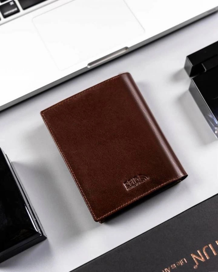 Odszyty bardzo trwale z doskonałej jakości gładkiej skóry naturalnej. Duży portfel o klasycznej stylistyce. Model w orientacji pionowej bez zapięcia zewnętrznego. Model mieści dowód rejestracyjny. Wyposażony w technologię RFID BLOCKING SYSTEM.